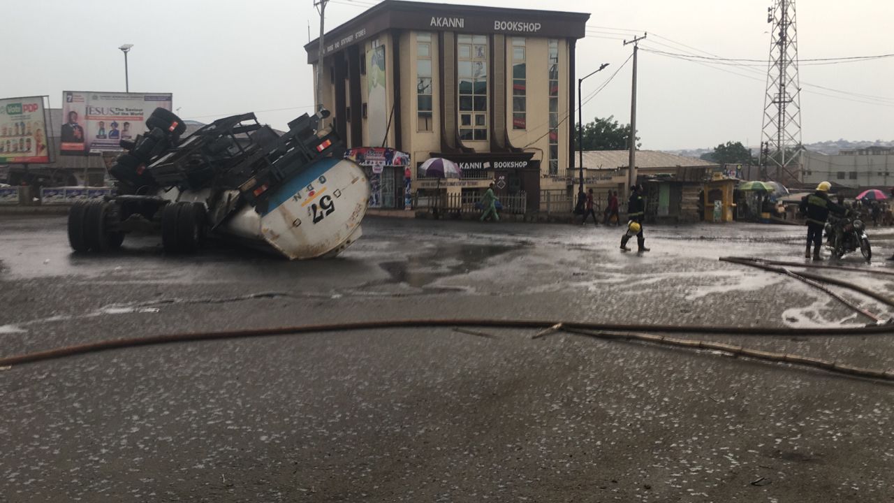 DAILY POST reports s that a petroleum-laden tanker, on Saturday afternoon skidded and fell as it made to negotiate the Takie roundabout in Ogbomoso leaving an apprentice severely wounded in the leg.