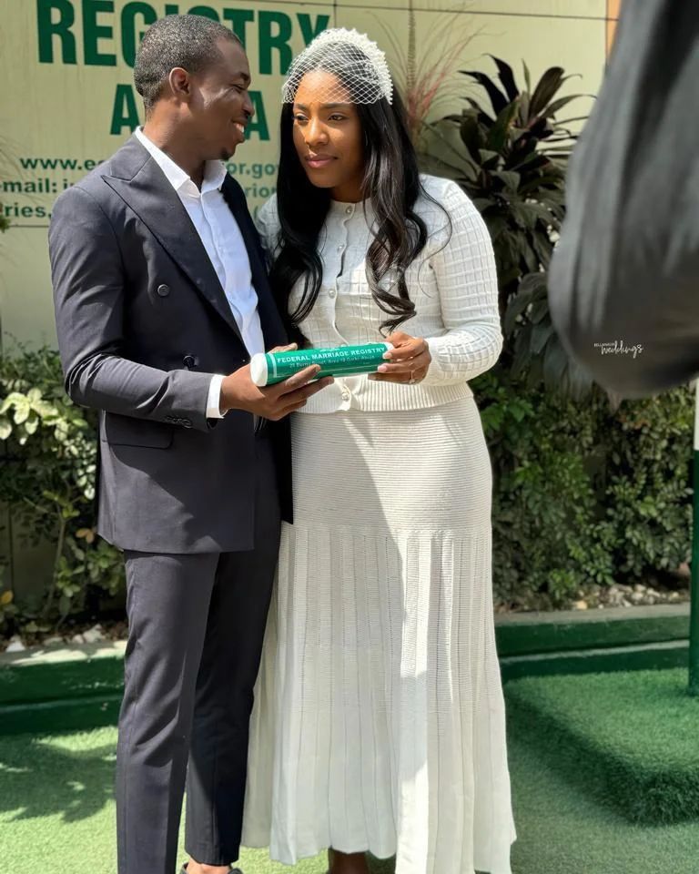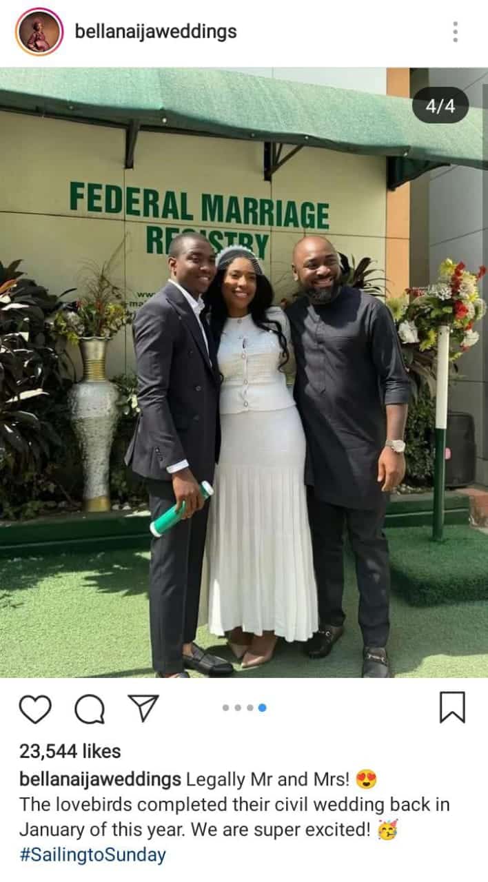 Bella Naija Weddings shared photos of the court wedding and wrote: “Legally Mr and Mrs! 😍 The lovebirds completed their civil wedding back in January of this year. We are super excited! 🥳 #SailingtoSunday.”