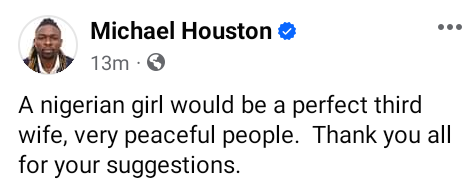 “A Nigerian girl would be a perfect third wife, very peaceful people. Thank you all for your suggestions,” he added.