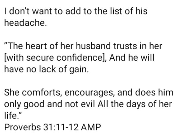"The heart of her husband trusts in her [with secure confidence], And he will have no lack of gain. She comforts, encourages, and does him only good and not evil All the days of her life.“ Proverbs 31:11-12 AMP''