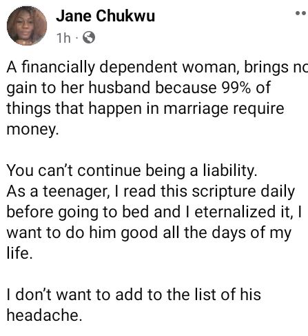 A Nigerian lady, Jane Chukwu, has taken to Facebook to opine that a woman who is financially dependent is of no value to her husband.