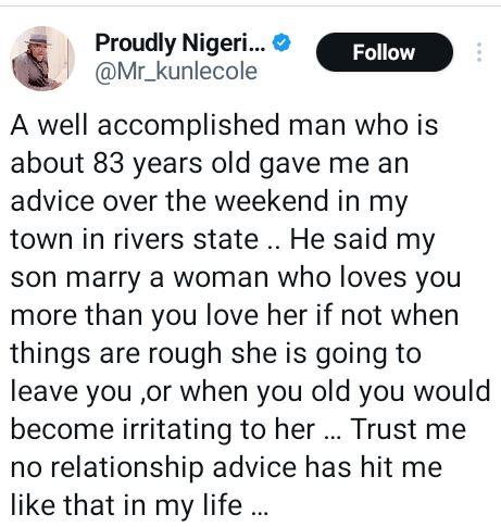 “A well accomplished man who is about 83 years old gave me an advice over the weekend in my town in rivers state. He said my son marry a woman who loves you more than you love her if not when things are rough she is going to leave you ,or when you old you would become irritating to her … Trust me no relationship advice has hit me like that in my life,” he wrote on Tuesday.