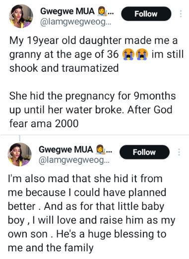 “My 19 year old daughter made me a granny at the age of 36. I 'm still shook and traumatized. She hid the pregnancy for 9 months up until her water broke. After God fear ama 2000,” she revealed in a post on Wednesday, March 27, 2024.