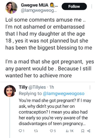 "Lol some comments amuse me. I'm not ashamed or embarrassed that I had my daughter at the age 18 , yes it was not planned but she has been the biggest blessing to me. I'm a mad that she got pregnant, yes any parent would be. Because I still wanted her to achieve more
