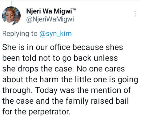 “She is in our office because she's been told not to go back unless she drops the case. No one cares about the harm the little one is going through. Today was the mention of the case and the family raised bail for the perpetrator.”