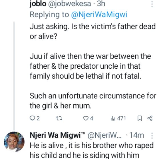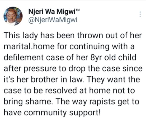 “This lady has been thrown out of her marital home for continuing with a defilement case of her 8yr old child after pressure to drop the case since it's her brother in law. They want the case to be resolved at home not to bring shame. The way rapists get to have community support,” she wrote.