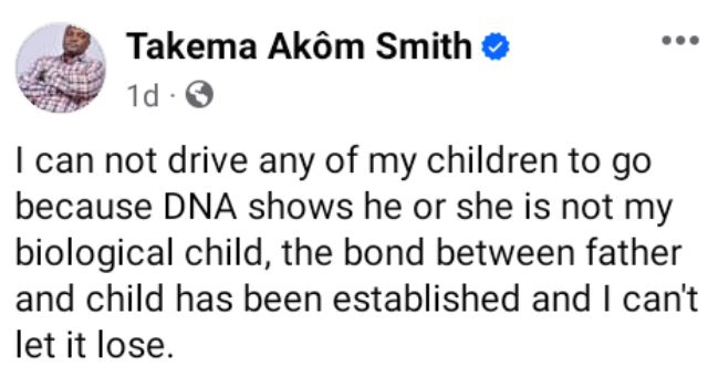 “I can not drive any of my children to go because DNA shows he or she is not my biological child, the bond between father and child has been established and I can't let it lose,” he wrote in a Facebook post on Wednesday, March 27.