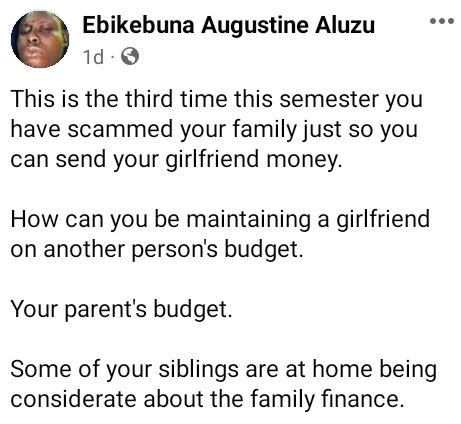 “This is the third time this semester you have scammed your family just so you can send your girlfriend money. How can you be maintaining a girlfriend on another person's budget,” he wrote in a Facebook post on Thursday, March 28.