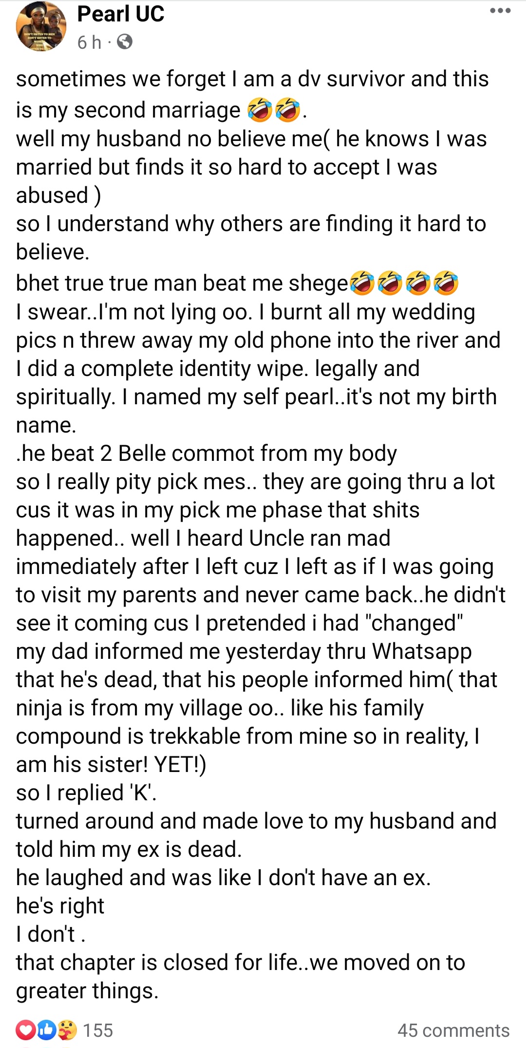 She wrote: “so I replied 'K'. turned around and made love to my husband and told him my ex is dead. he laughed and was like I don't have an ex. he's right I don't . that chapter is closed for life..we moved on to greater things.”