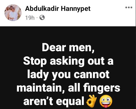“Dear men, stop asking out a lady you cannot maintain. All fingers are not equal,” she wrote in a post on Sunday, March 31.