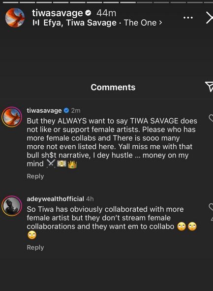 “But they ALWAYS want to say TIWA SAVAGE does not like or support female artists. Please who has more female collabs and There is sooo many more not even listed here. Yall miss me with that bull sh$t narrative, I dey hustle money on my mind,” she wrote.