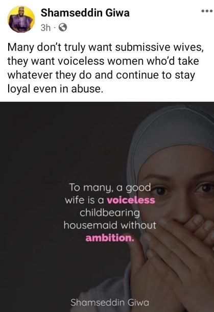 A Nigerian marriage therapist, Shamseddim Giwa, has opined that in marriages, many men don’t truly want submissive wives. According to Mr. Giwa, many men want voiceless women who’d take whatever they do and continue to stay loyal even in abuse.