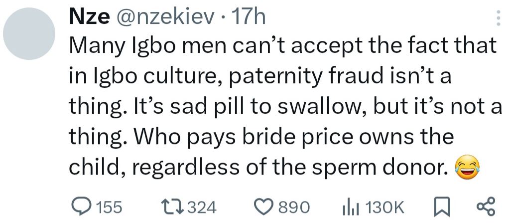 He wrote: “Many Igbo men can't accept the fact that in Igbo culture, paternity fraud isn't a thing. It's sad pill to swallow, but it's not a thing.”