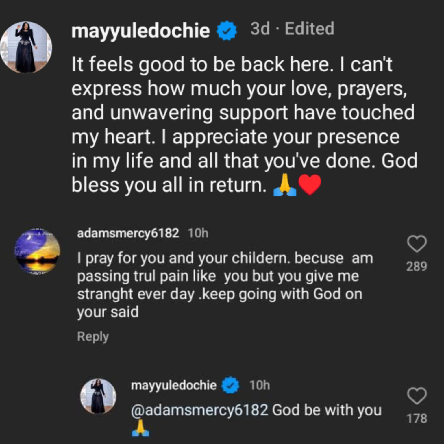 Reacting to this, a follower, identified as @adamsmercy6182, commented on May’s post, revealing that she too is battling personal difficulties.