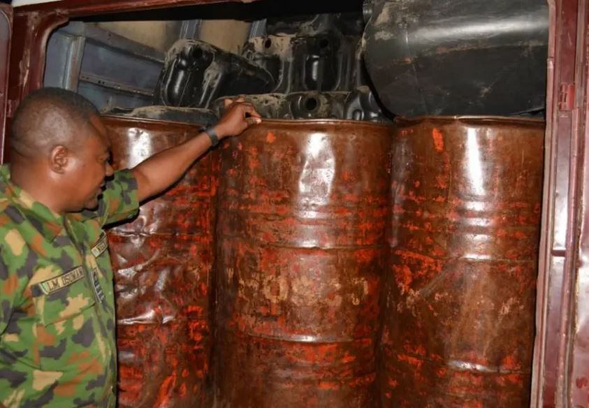 “The illegal fuel depot contains eight storage tanks of 50,000 litres capacity each, laden with about 57,000 litres of AGO; a Tanker laden with about 7,000 litres; a bus with 30 jerry cans laden with about 1,500 litres. The total product discovered is about 65,000 litres of AGO which is estimated to be about 89 Million Naira based on the current price of AGO (₦1,350)”.