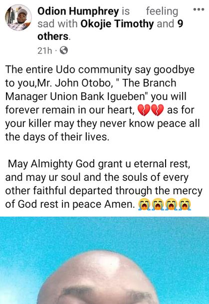 “The entire Udo community say goodbye to you, Mr. John Otobo, the Branch Manager Union Bank Igueben. You will forever remain in our heart. As for your killer, may they never know peace all the days of their lives. May Almighty God grant u eternal rest, and may ur soul and the souls of every other faithful departed through the mercy of God rest in peace, Amen," he wrote.