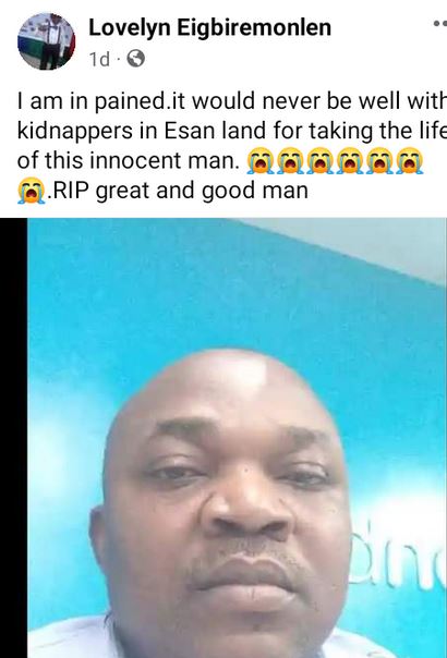 According to one, the deceased was kidnapped a few days ago between Ugbegun and Uromi, while on his way home from work.