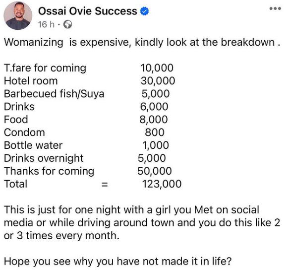 Ossai Ovie Success, an aide to the governor of Delta State, has taken to Facebook to opine that womanizing is expensive.