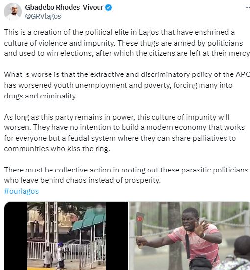 ‘’This is a creation of the political elite in Lagos that have enshrined a culture of violence and impunity. These thugs are armed by politicians and used to win elections, after which the citizens are left at their mercy.
