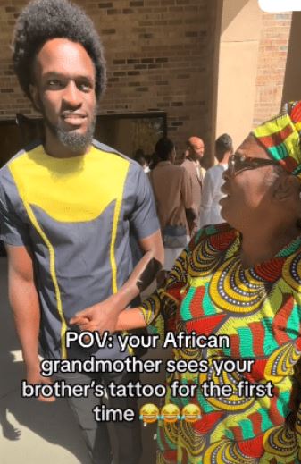 A video has captured the reaction of an elderly woman after she saw her grandson’s tattoo for the first time.