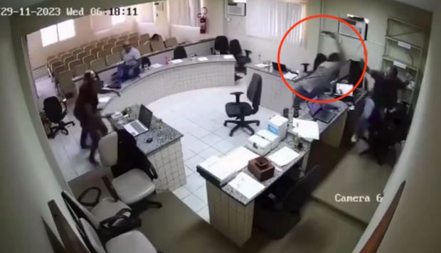 Moments later, De Moura collapses on the floor behind the magistrates’ bench, but Terto rushes around it and furiously strikes him twice in the head with the gun, the video shows.