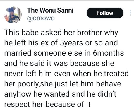 A Nigerian lady, Wonu Sanni, has taken to the 'X' platform to explain why a man refused to marry his girlfriend after dating her for 5 years.
