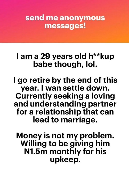 A hookup lady has offered N1.5m monthly to any man willing to marry her.