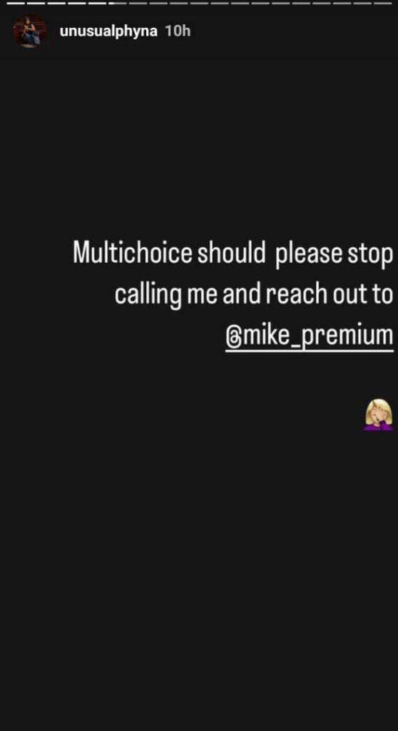 On her Instagram story, she pleaded with Multichoice to stop calling her and reach to famous talent manager, Mike Premium.