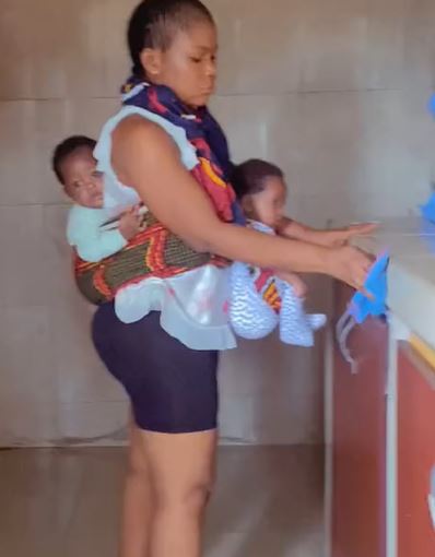 A video has captured the moment a strong Nigerian woman carried her twin baby girls while performing house chores alone at home.