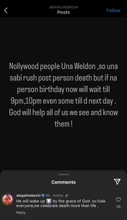 “Nollywood people Una Weldon ,so una sabi rush post person death but if na person birthday now will wait till 9pm,10pm even some till d next day.