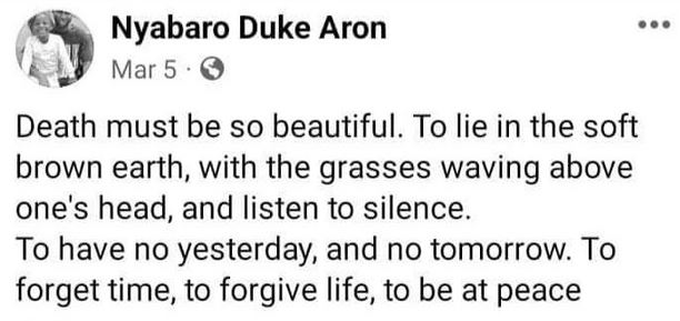 Nyabaro had on March 5, 2024, posted that death was beautiful and that one remains silent forever.