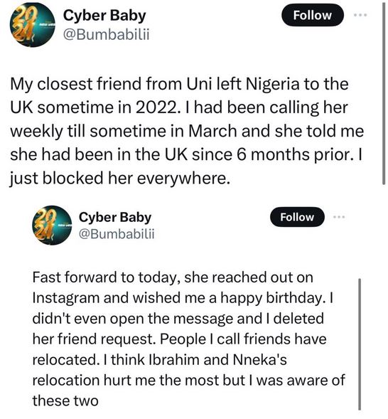 The lady recounted how she blocked a close friend of hers on all social media platforms after finding out she had relocated to the UK in 2022.