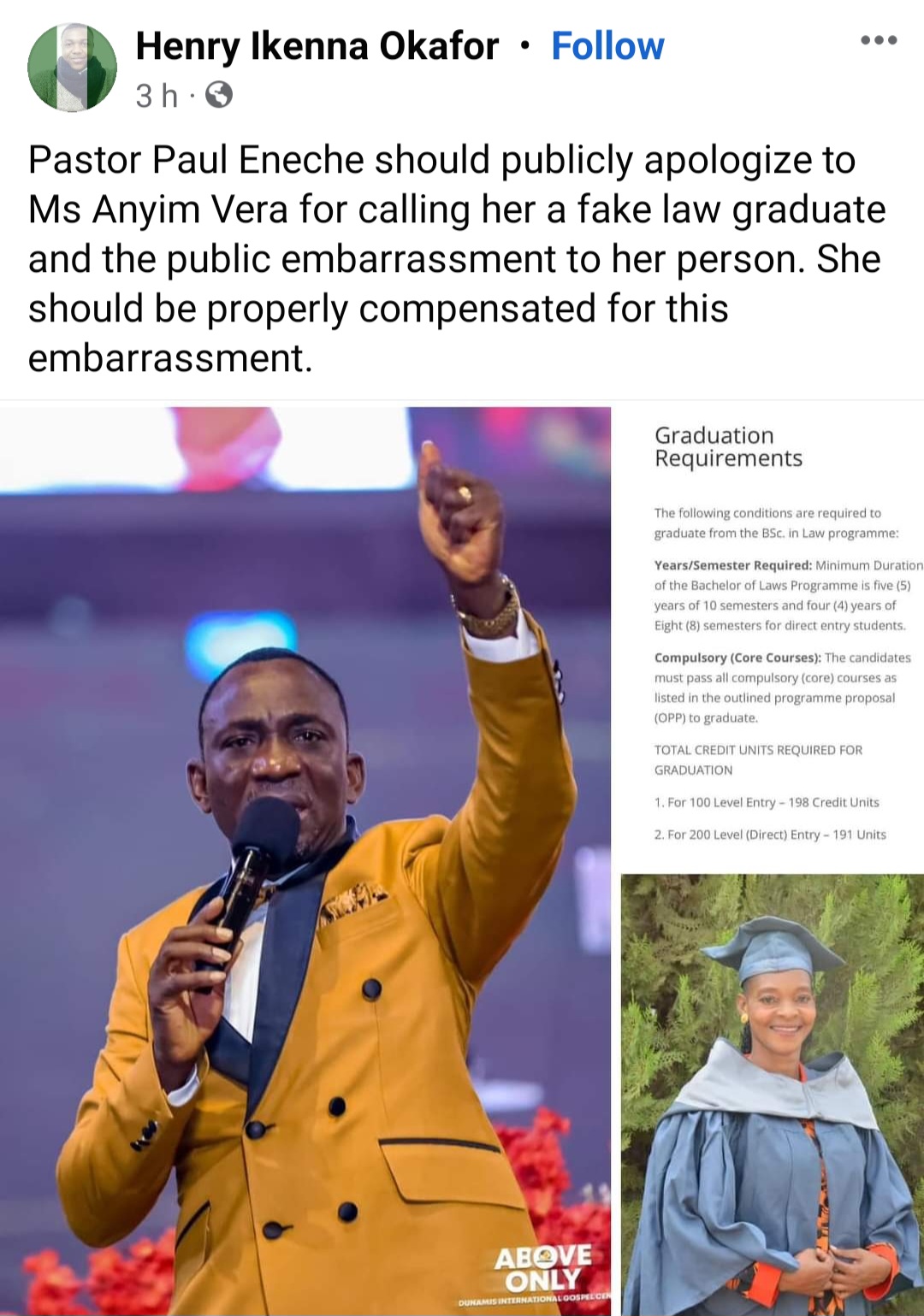 However, in the middle of her testimony, Pastor Enenche interrupted her and accused her of lying. He told her she didn't sound like a Law graduate, going by how she speaks. He also told her that there is nothing like a "Bachelor of Law" and demanded she leaves the pulpit (See here).