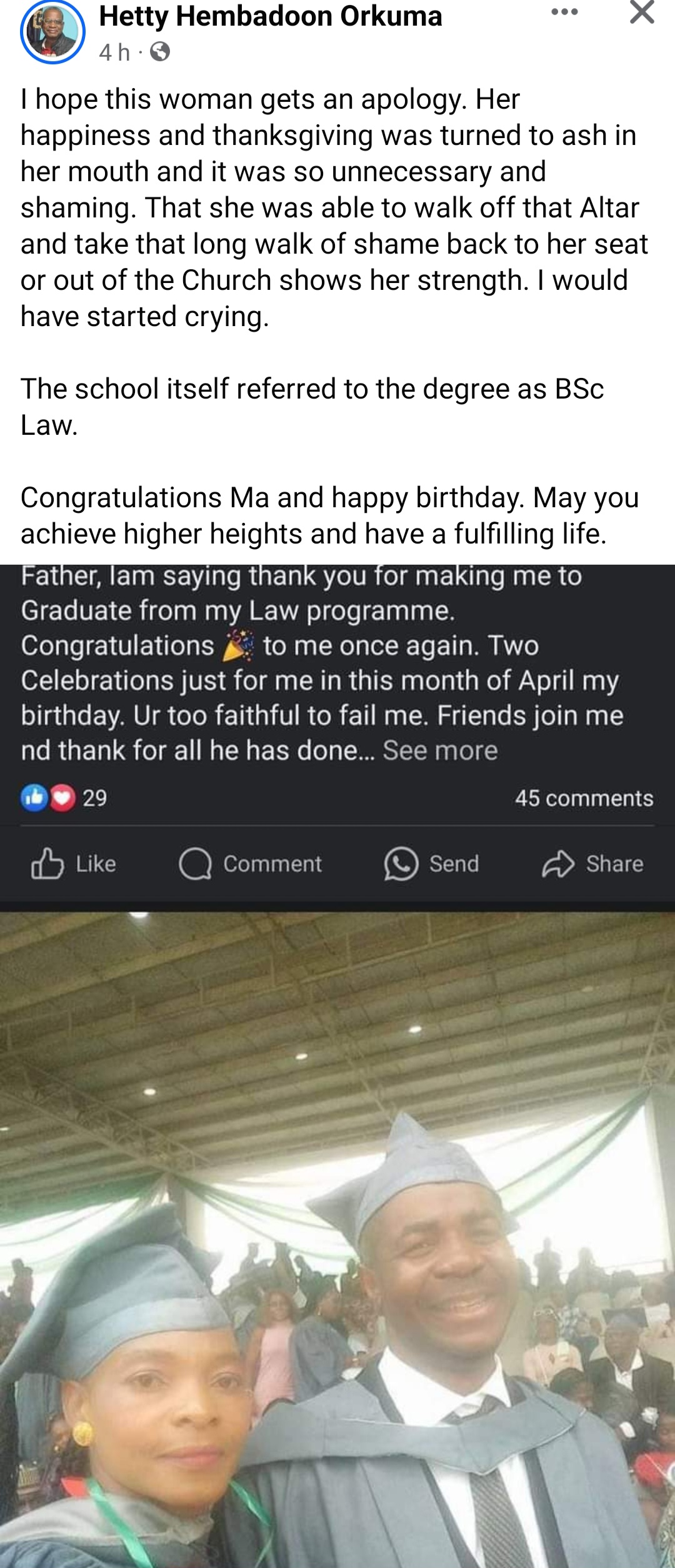 The member mounted the pulpit to give a testimony on Sunday, April 14, after successfully graduating with a "Bachelor of Law" degree from the National Open University of Nigeria on Saturday, April 13.