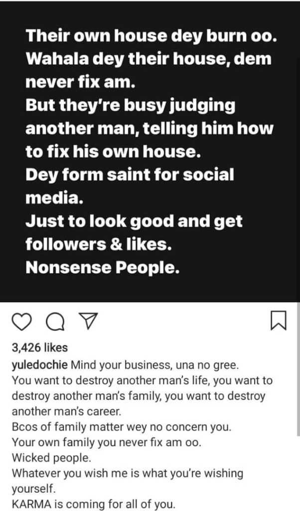 “Their own house dey burn oo. Wahala dey their house, dem never fix am. But they’re busy judging another man, telling him how to fix his own house. Dey form saint for social media. Just to look good and get followers & likes. Nonsense People. 3,426 likes ♡ yuledochie Mind your business, una no gree. You want to destroy another man’s life, you want to destroy another man’s family, you want to destroy another man’s career. Bcos of family matter wey no concern you. Your own family you never fix am oo. Wicked people. Whatever you wish me is what you’re wishing yourself. KARMA is coming for all of you.”