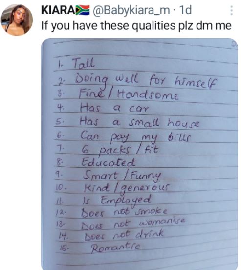 Kiara, a South African lady, who is seeking a man for a relationship has made a list.