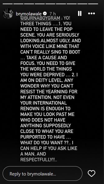Further addressing himself as a deity, Brymo also asks Burna what he wants from him.