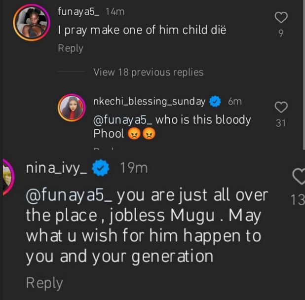 The troll, known only as Funaya, posted a menacing statement in Regina Daniels’ post’s comment section, wishing for one of Junior Pope’s kids to pass away.