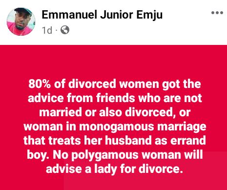 Emmanuel, who stated this in a Facebook post on Tuesday, April 16, said no woman in a polygamous marriage will advise a lady to divorce her husband.