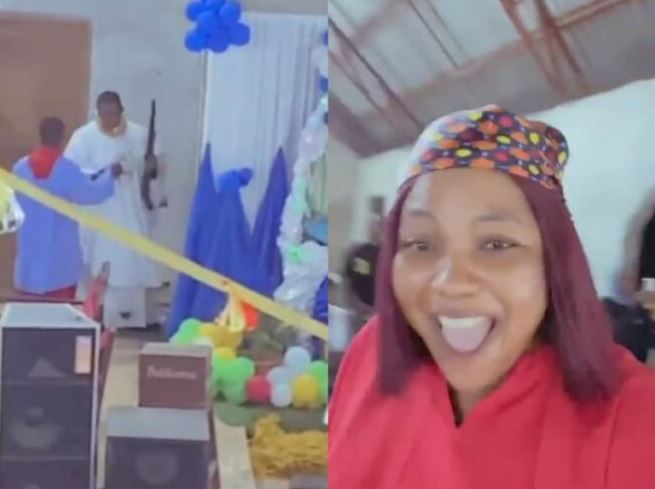 A video of a lady hailing a Reverend Father who fired a gun during church service has surfaced online.