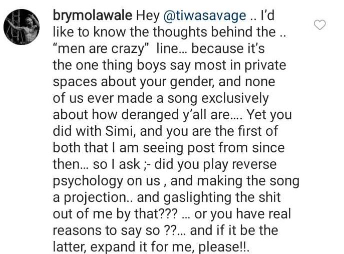 In his words: “Hey @tiwasavage .. I’d like to know the thoughts behind the .. “men are crazy” line… because it’s the one thing boys say most in private spaces about your gender, and none of us ever made a song exclusively about how deranged y’all are…. Yet you did with Simi, and you are the first of both that I am seeing post from since then… so I ask ;- did you play reverse psychology on us, and making the song a projection.. and gaslighting the shit out of me by that??? … or you have real reasons to say so ??… and if it be the latter, expand it for me, please!!.”