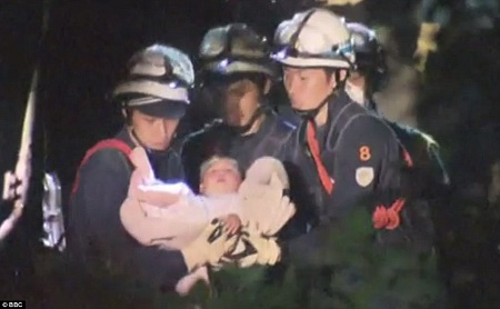This astonishing footage shows the moment a eight-month-old girl is pulled alive from a collapsed building following a devastating earthquake in Japan.