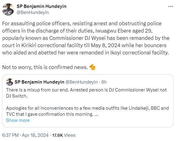 ‘’For assaulting police officers, resisting arrest and obstructing police officers in the discharge of their duties, Iwuagwu Ebere aged 29, popularly known as Commissioner DJ Wysei has been remanded by the court in Kirikiri correctional facility till May 8, 2024 while her bouncers who aided and abetted her were remanded in Ikoyi correctional facility.