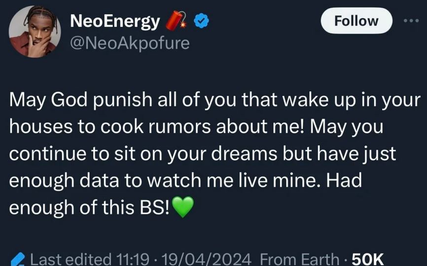 “May God punish all of you that wake up in your houses to cook rumors about me! May you continue to sit on your dreams but have just enough data to watch me live mine. Had enough of this BS!💚