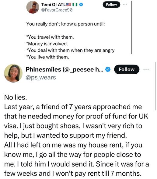 According to the X user, her friend reached out to her last year appealing for money to boost his proof of funds as he was applying for a UK visa.