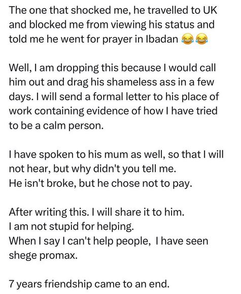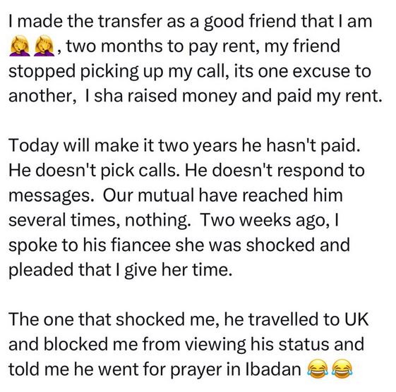 A Nigerian woman shared her story of how her friendship of more than seven years came to an end after she lent the money she had saved for her house rent to her friend.