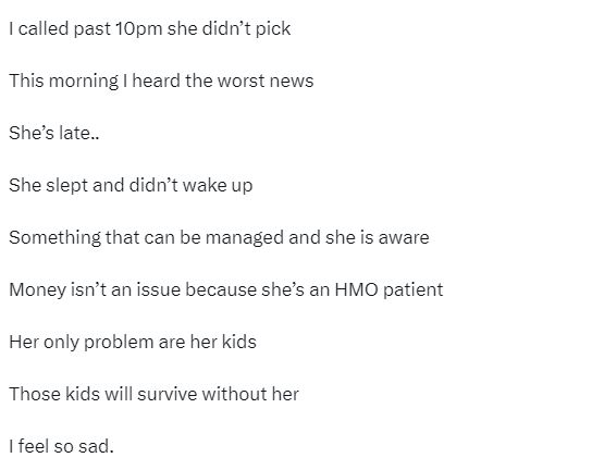 An X user who shared the story online said the pregnant woman refused to be admitted because she feared for her other kids who were all by themselves at home.