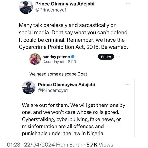 In a post shared on X, Adejobi reminded Nigerians of the existence of the Cybercrime Prohibition Act, 2015 which gives the court the jurisdiction to sentence anyone found guilty of making social media comments and claims they cannot defend in court.