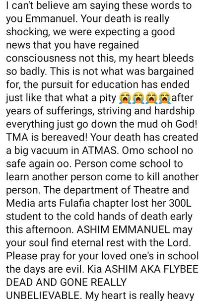 "This is not what was bargained for, the pursuit for education has ended just like that. What a pity after years of sufferings, striving and hardship everything just go down the mud oh God! TMA is bereaved! Your death has created a big vacuum in ATMAS. Omo school no safe again oo. Person come school to learn another person come to kill another person.