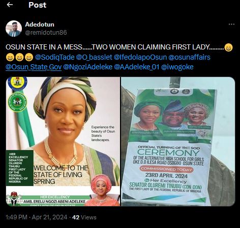 Both wives of Gov Ademola Adeleke of Osun State have stirred reactions over the posters they printed to welcome the First Lady, Sen Oluremi Tinubu to the state.